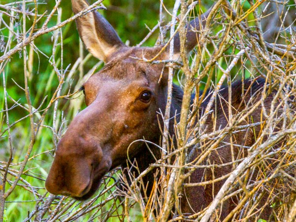 I wasn’t very far into my drive when I saw something move to the right of my car. It’s very hard to see a moose in the trees and brush, because they blend in, but all I needed to do was see the leaves move and I knew I was golden