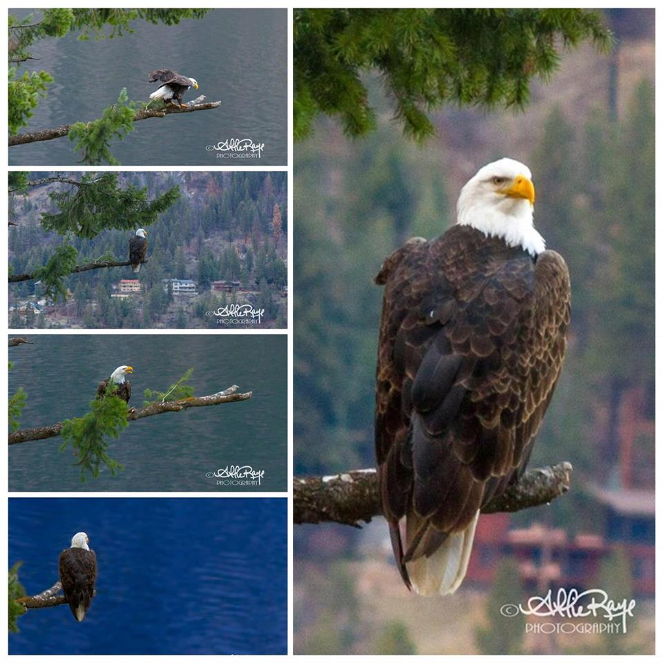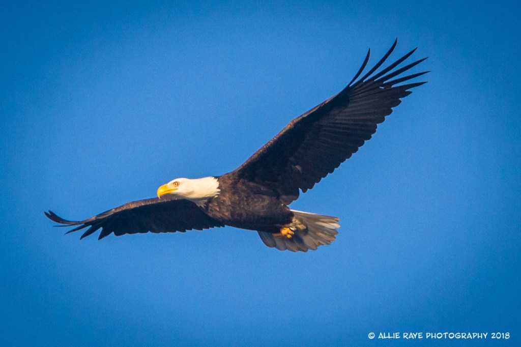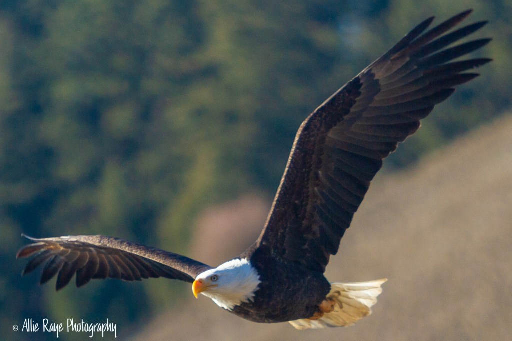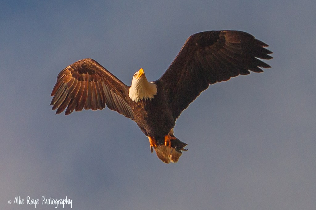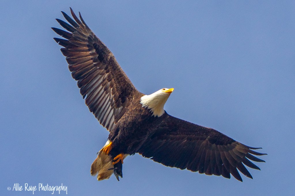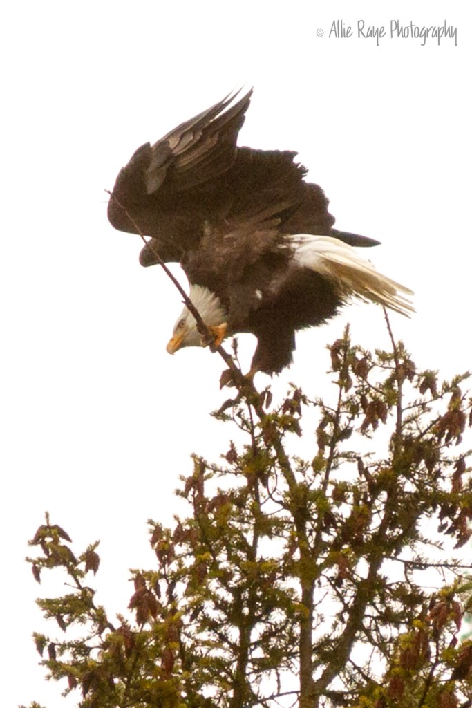The eagles sat perched in trees all along the river. They would wait until a Kokanee salmon would swim close to the surface of the water, and then swoop down and pick up dinner. I was shooting and shooting while they sat high up in the trees knowing I would get at least one clear shot. I used a 70-200mm lens on my Canon 7D so I could get a little closer. The white background was not edited because the day was extremely cloudy and I knew I’d have a blue sky, eventually. And, so I did. These are just a few that I captured over 3 months.