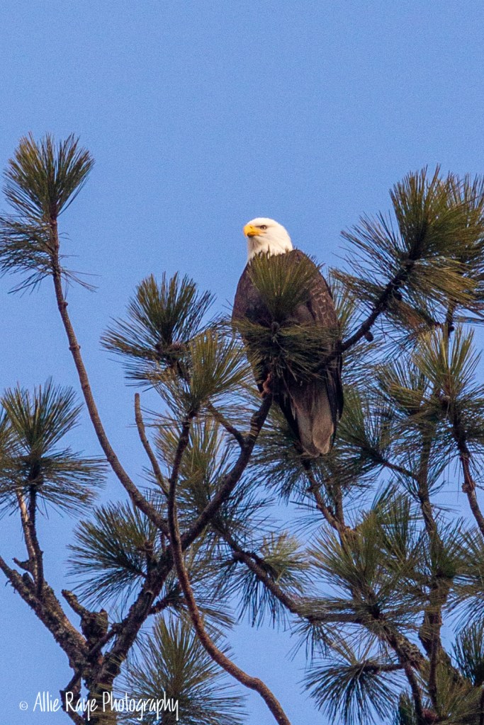 In 2017, I found out that the eagles are in Bayview, ID. I had no idea and as a photographer, I knew I had to at least try. I was so excited and drove all the way out to Bayview, which is at least an hour and a half from where I live. It was pretty late in the season but I was determined to find one to photograph. I had no experience, no zoom or fast lens but I had desire. I asked the townsfolk where I could find one and they pointed me in the right direction. It’s a very small town so I would ask anyone I saw where an eagle was. Keep in mind, I had never seen one in person. Eventually, a man pointed to an eagle that was perched on a branch. I was so excited. I used my 28-135 lens on my 7D to photograph. I was parked along a fence on a property that was for sale, so there were no people in sight. The man that showed me the eagle works the properties and assured me I could stay there as long as I wanted.