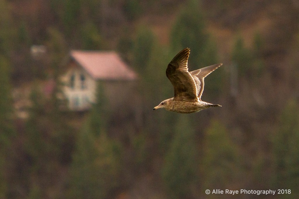 We call these “practice birds.” There is a lot of skill (and luck) that goes into photographing eagles and freezing action. So, we practice setting exposure and focus, etc. on these pesky birds called seagulls. They can be a menace when trying to get a perfect shot of an eagle, because they want the fish, too. The image on the left is an immature seagull and the right is just a tush of one flying away. They really are good practice, as the immature seagull was a complete shock.